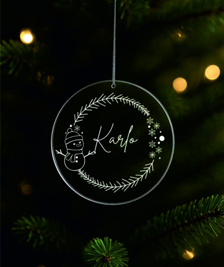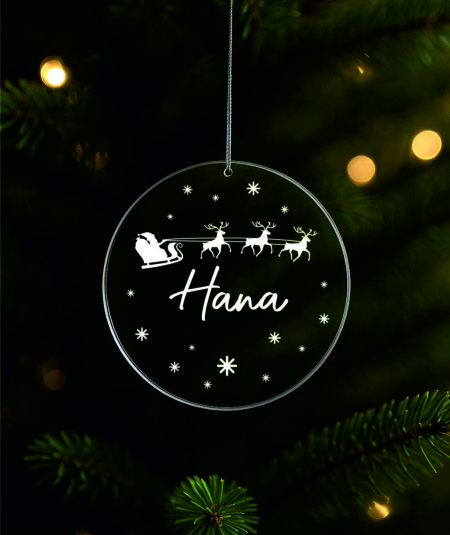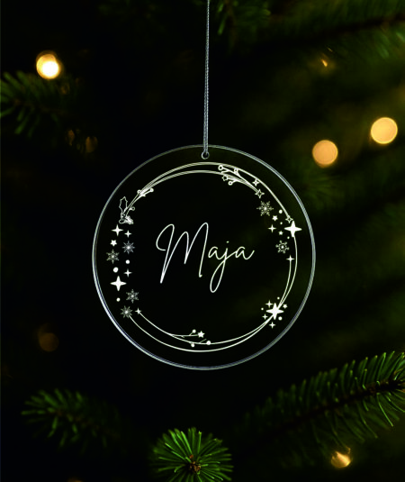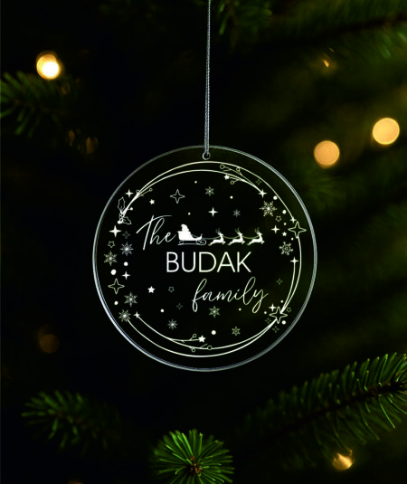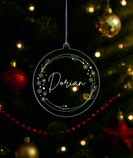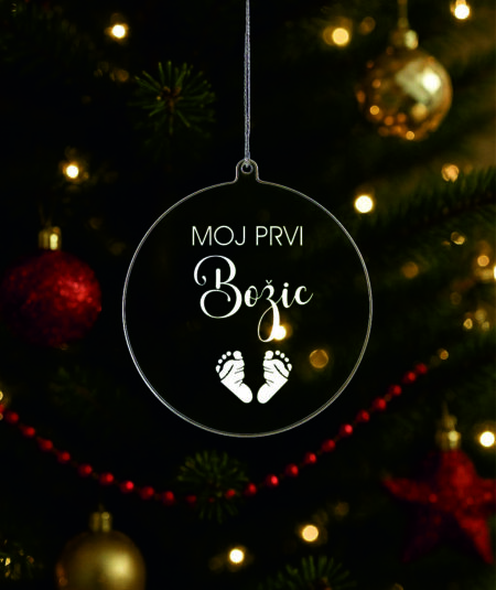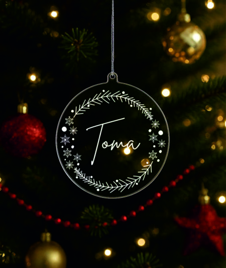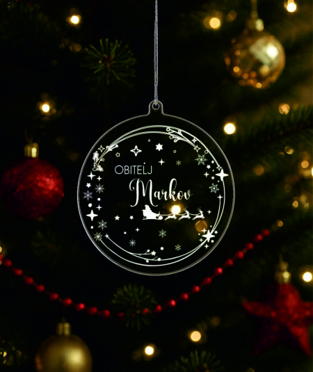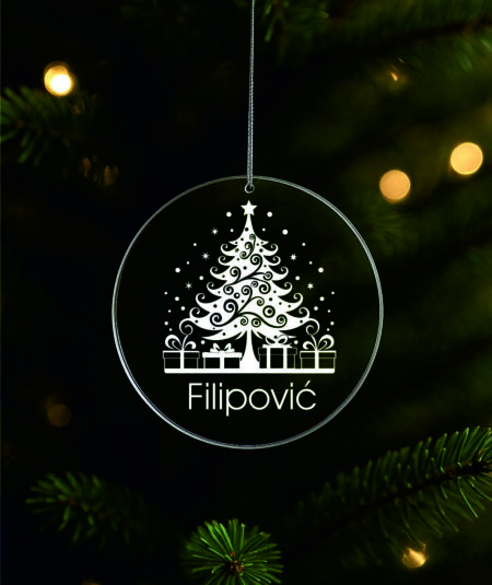 Ukras za bor promjera 9 cm sa gravurom možete naručiti sa tekstom po želji u zlatnoj , srebrnoj, prozirnoj ili drvenoj varijanti.