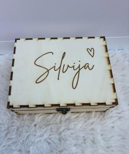 Personaliziranu drvenu kutiju s gravurom na i ispod poklopca dimenzije 20×15 cm.
