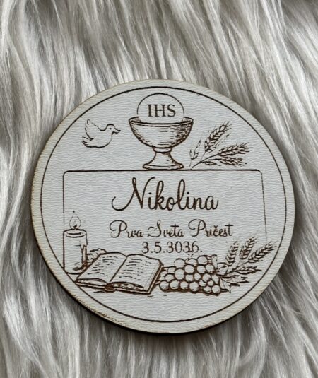 Drveni magnet  s gravurom  teksta po želji te grafikom u 2 verzije  kao zahvalnica gostima povodom Prve pričesti ili krizme. Veličina magneta  je 7 cm.  Magneti standardno dolaze pakirani u organdi vrećice.